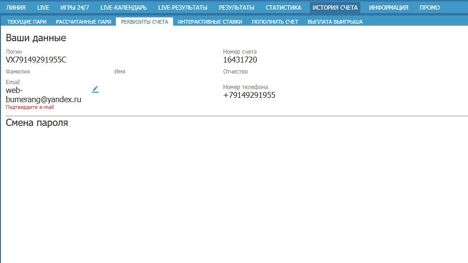 Чтобы войти в личный кабинет Бетсити, необходимо указать логин или номер телефона, а также ввести пароль. Панель пользователя представлена во вкладке "История счета" (панель сверху). Здесь представлены следующие разделы: