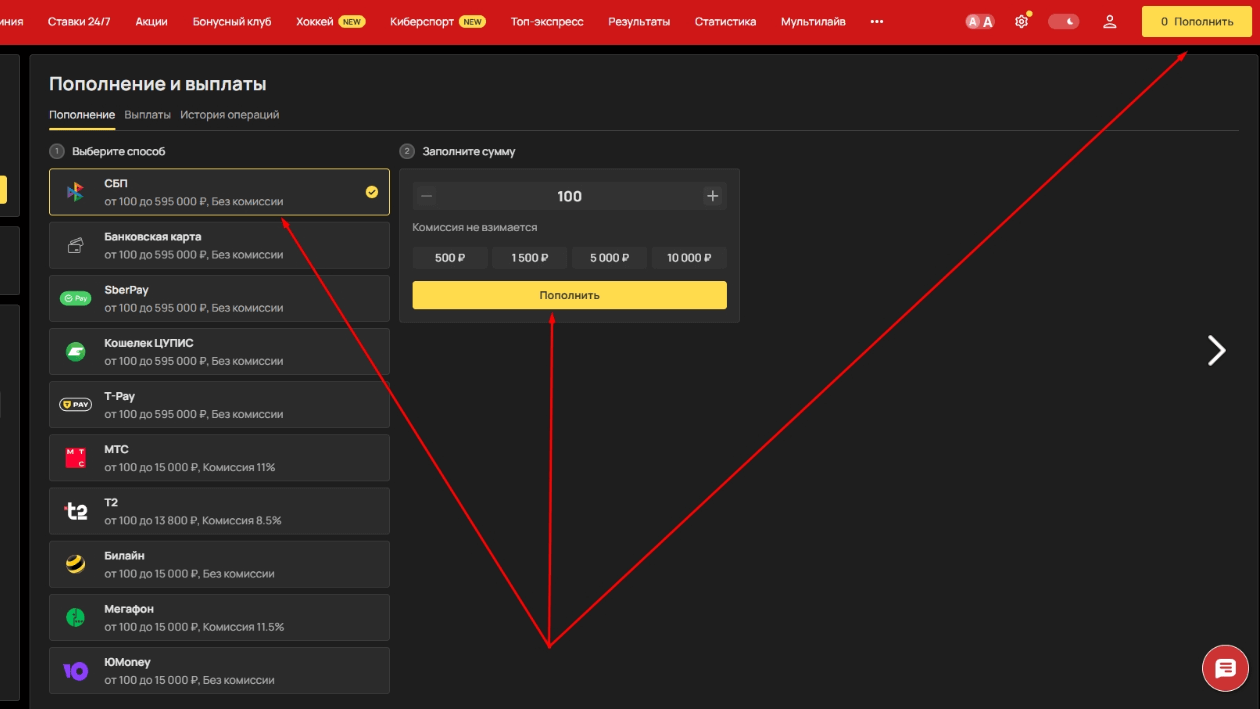 Чтобы пополнить счет в БК Олимп, достаточно кликнуть по кнопке “Пополнить” в верхней панели. Нужно выбрать интересующий метод депозита, указать сумму и нажать “Пополнить”. После этого беттор будет перенесен на страницу выбранной платежной системы. Здесь потребуется авторизоваться и подтвердить операцию.