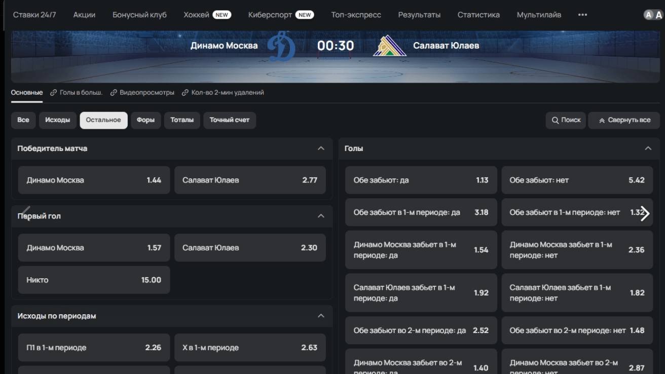 Наиболее подробную роспись букмекер предлагает на важнейшие чемпионаты по футболу (ТОП-5 европейских лиг, Еврокубки и РПЛ) и хоккею (НХЛ, КХЛ и международные первенства). Так, например, на матч Английской Премьер-Лиги в Олимп есть ставки на: исходы, тоталы, форы, результат первого тайма и матча, первый и последний гол, точный счет, результат и тотал, тоталы и форы в течение матча, статистику и прочее.