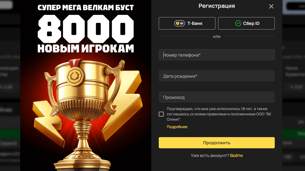 Откроется форма, в которой указываются контактные данные. Клиенты Сбера и Т-Банка могут пройти упрощенную регистрацию, если авторизуются в кабинете интернет-банкинга. В дальнейшем не придется подтверждать личность. Если у человека нет действующего счета в одном из этих банков, потребуется в полях ниже указать номер телефона, дату рождения (делать ставки на деньги можно с 18 лет) и промокод при наличии. После этого поставить галочку, которая подтверждает согласие с правилами и нажать “Продолжить”.