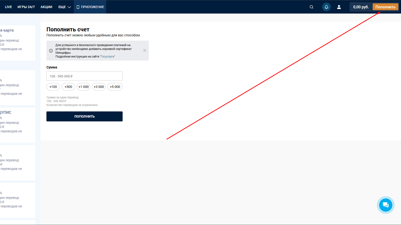 Чтобы внести депозит в БК Зенит, необходимо нажать кнопку “Пополнить” в верхней панели. Откроется страница со списком поддерживаемых систем. Выбираем подходящую и указываем сумму, затем кнопку “Пополнить”.